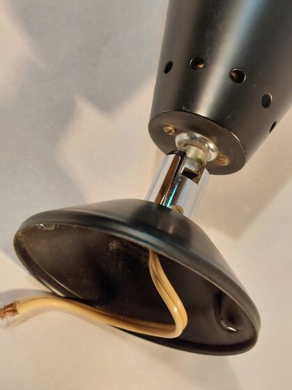 schwarzer metallspot vermulich regent aus den 60erjahren mit e27-fassung mit chromgelenk kippbar