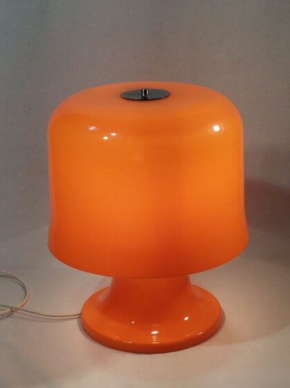 kleine (Nacht-)tischleuchte aus einem geschweiften chromband mit orange überfangenem opalglas in pilzform