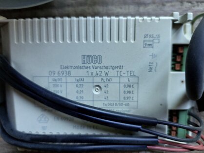 sehr guter zustand. mit elektronischem vorschaltgerät für leuchtstoffröhren von zb philips oder osram (dulux T/E Plus 42W/830) mit fassung GX24q-4. überall erhältlich. lassen sich auch auf e27 umrüsten.