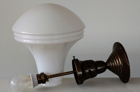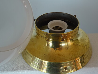 wie die siemens-leuchte von peter behrens von 1908 - messing mit zweiteiligem glaskörper, oben opalglas, unten mattglas geätzt, mit originaer, geschraubter messingfassung mit porzellanring