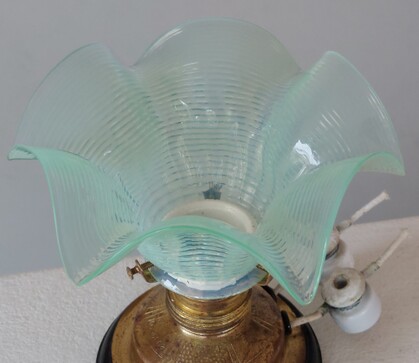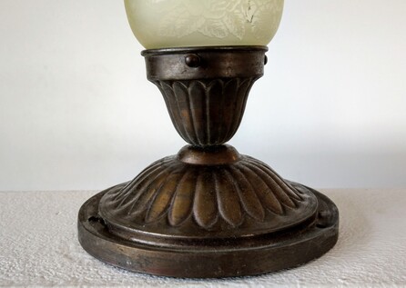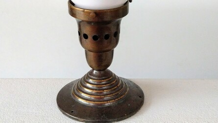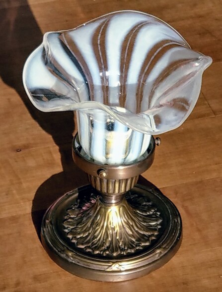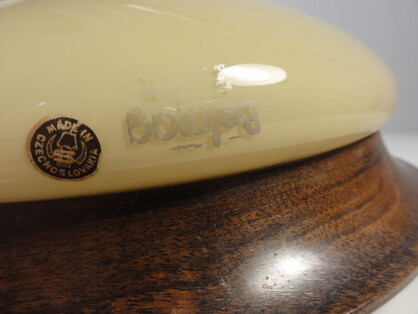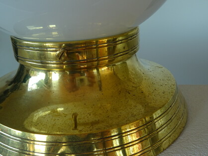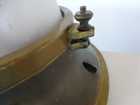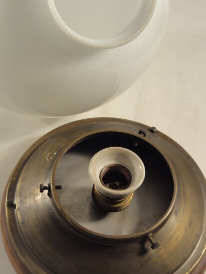 an schön patinierter messinghalterung auf holzring, schweres, dickwandiges opalglas