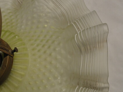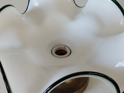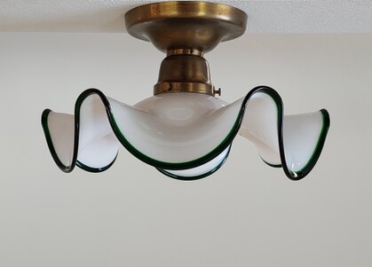 dickes, schweres mundgeblasenes glas in reinweiss mit umlaufender grüner glasbordüre. an messingmontage.