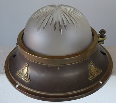 schwere und sehr schön verarbeitete originale jugendstil messingleuchte mit geschnittener klasglaskuppel als deckenleuchte oder wandleuchte. mit originalem holzring