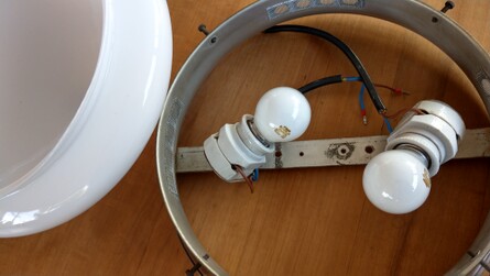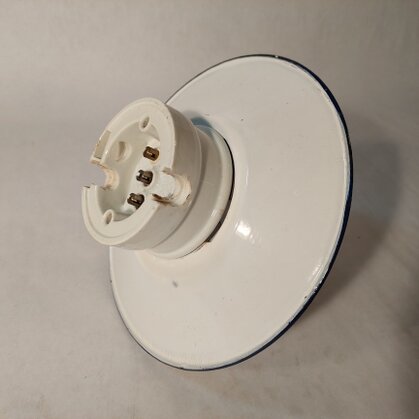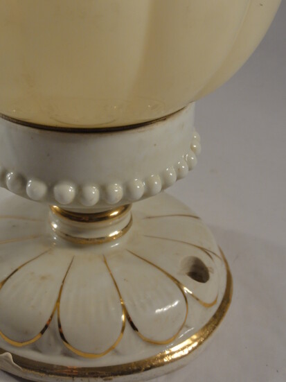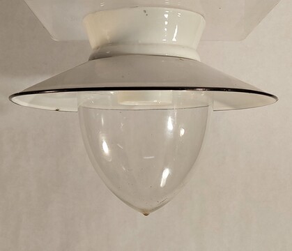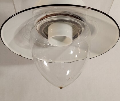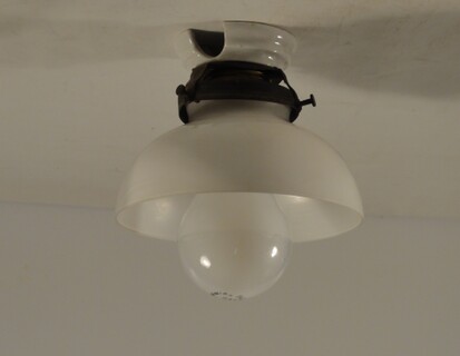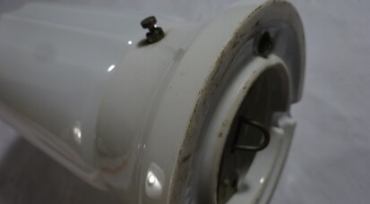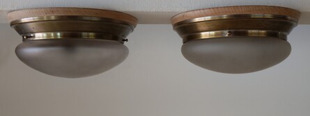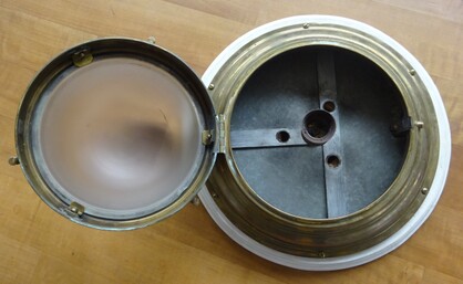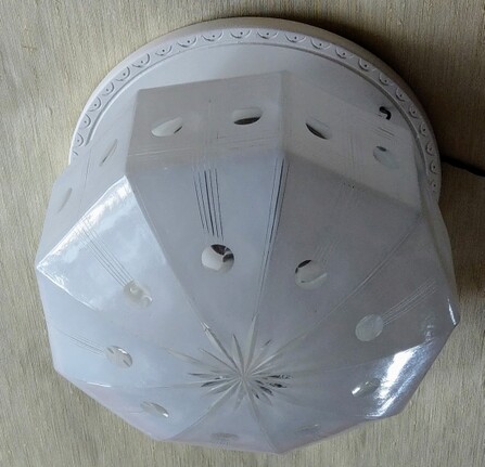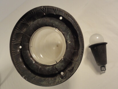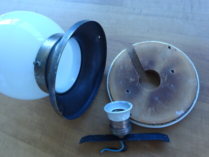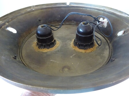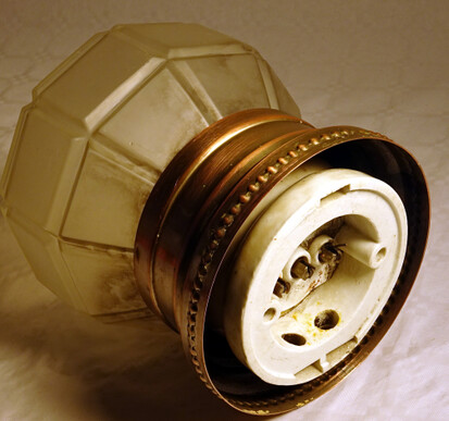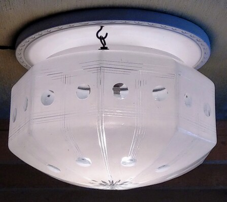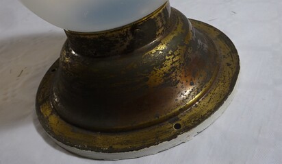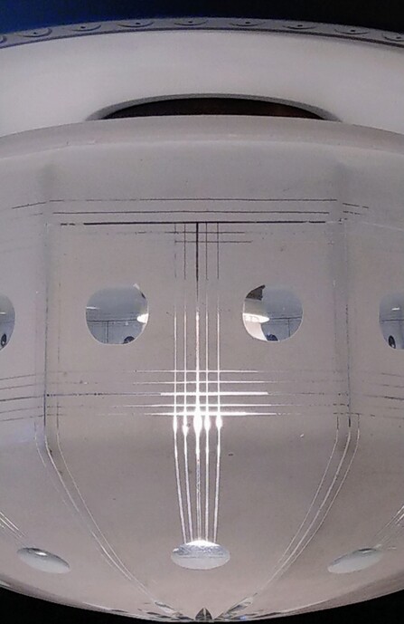 einzelne gebrauchsspuren, so zb löcher der ehemaligen stromzuführungen, am inneren glasrand (nicht sichtbar) kleinere absplitterungen, vermutlich um ca 1960 mit anderen fassungen nachgerüstet (nicht sichtbar)