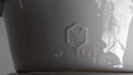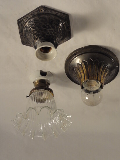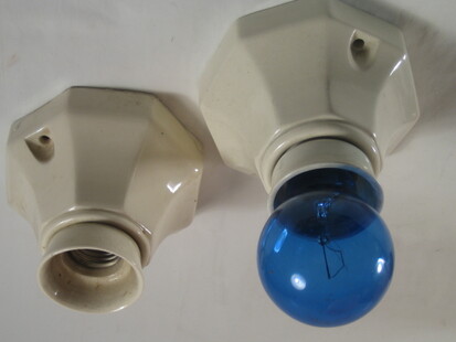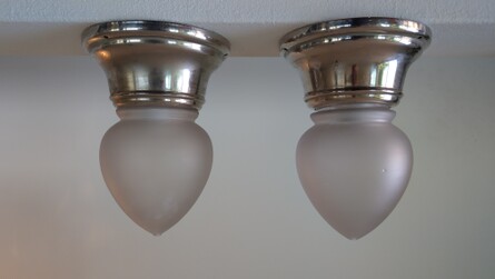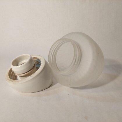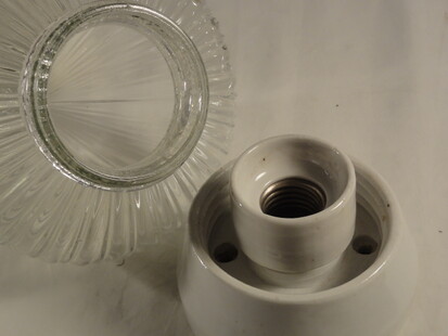 schweizer jugendstil deckenleuchten um die vorletzte jahrhundertwende. zwiebelförmiges, mattgeätztes glas mit schraubgewinde auf vernickeltem, breitem hals. porzellanhalterung und fassung. geprägtes schweizerkreuz mit patentnummer 111659