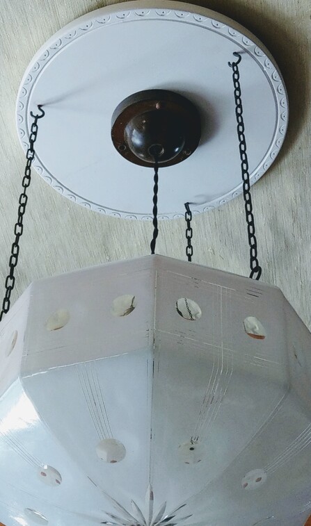 ganz spezielle jugendstil cloche, neuneckig, weiss emailliert mit geschliffenen kreisen, linien und einem stern. im stil der wiener secession um kolomann moser. original um 1900. die cloche hängt an 3 haken an einem holzdeckenstück (vermutlich später angefertigt) mit vernickelter e27-fassung. die ganze leuchte liesse sich mittels ketten auch in jeder gewünschten länge abhängen-