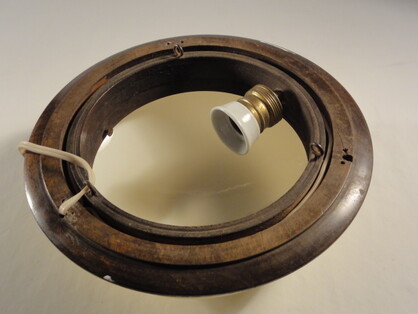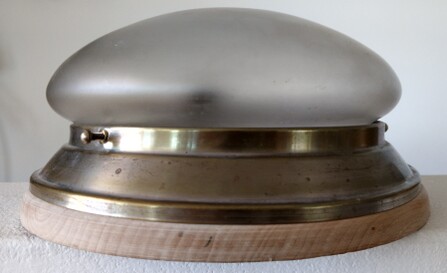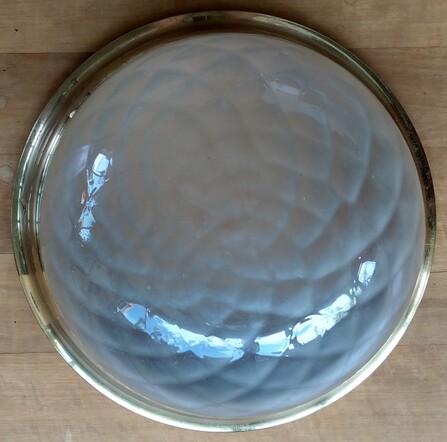 massives sicherheitsglas, abgedunkelt, stabile messingfassung, patiniert, metallteile nummeriert 698/1, auf passendem holzmontagering