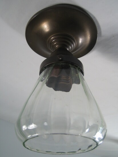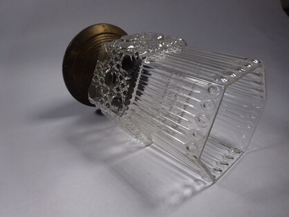 formvollendete sachliche jugendstil deckenleuchte an patiniertem messinghalter mit originalem, sechseckigem klarglas schirm mit blasen- und stäbchenmuster