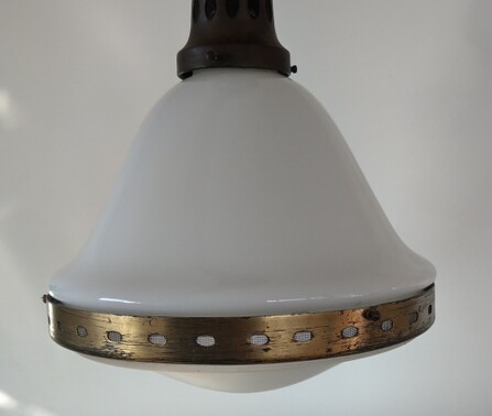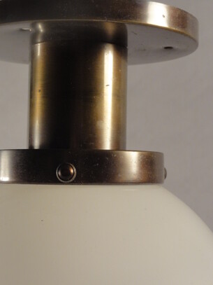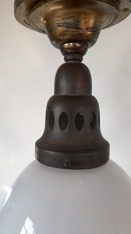 aufklappbares opalglas an schön gebräunter messingaufhängung, im stil der siemens-leuchte von peter behrens 1908, vermutlich bag turgi um 1920/25