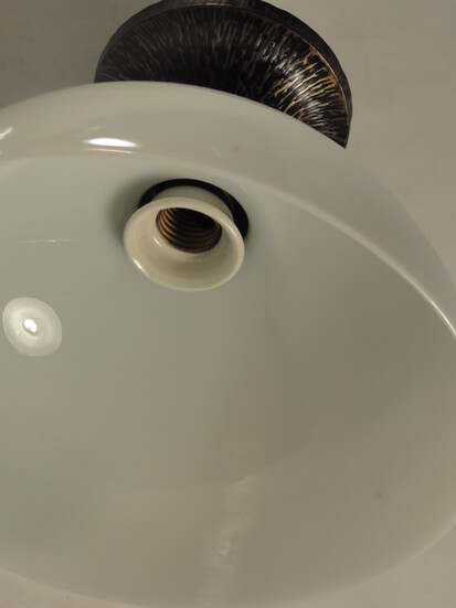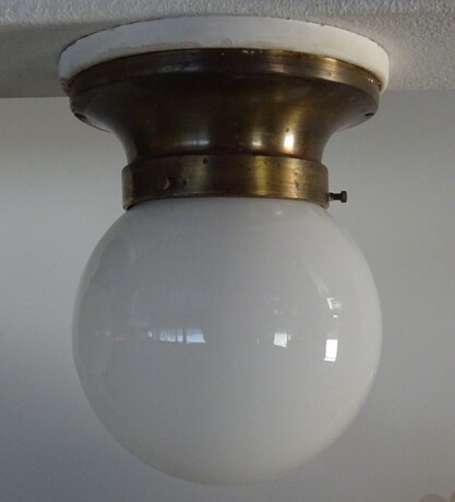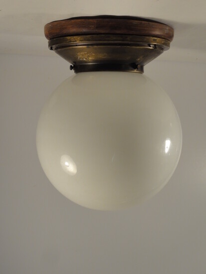 tropfenförmige deckenleuchte in anlehnung an peter behrens entwurf von 1908. originale messingaufhängung brüniert mit geschraubter messingfassung und porzellanring um 1910/20. 2schichtiges opalglas aus einem einzigen stück - im gegensatz zum originalentwurf von 1908, bei dem das glas aus zwei teilen zusammengesetzt wird.