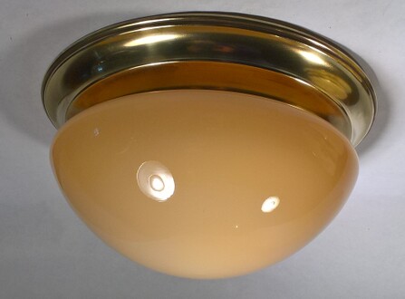 4 stück sehr grosse deckenkuppeln aus der vorletzten jahrhundertwende. hochgewölbtes, opaleszierendes wabenglas an breitem messingring. aus einem basler schulhaus. 1 e27 geschraubte fassung aus der zeit. deckenmontagestück im ursprünglichen stil erneuert (montiert nicht sichtbar).