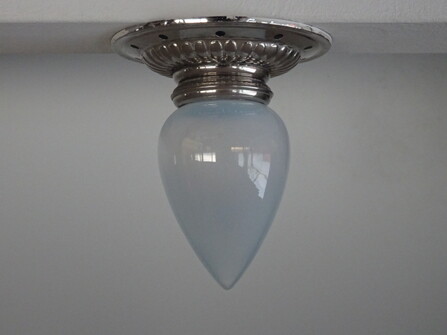 ausserordentlich formschöne und spezielle kleine jugendstil deckenleuche mit fein opaleszierendem, leicht mattiertem glas in tropfenform. an gestufter nickelmontage mit originaler porzellanfassung e 27