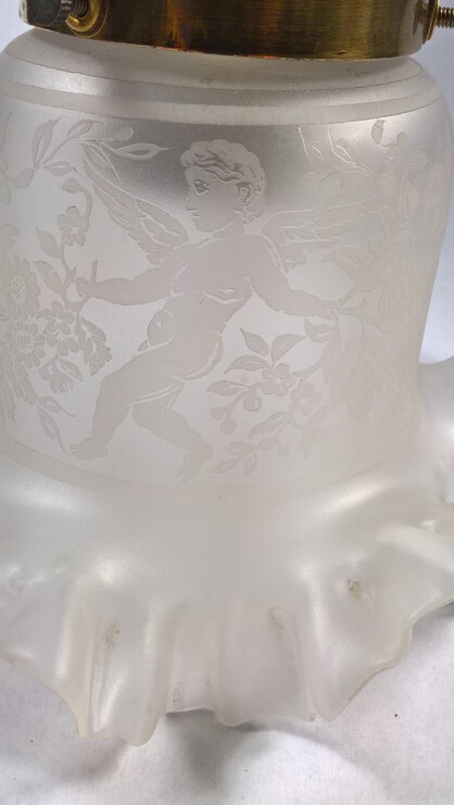 wunderschön geätztes jugendstil blumenglas mit kleinen engelsfiguren bzw cupidos. an porzellanmontage mit echtgoldverzierung. messingfassung.