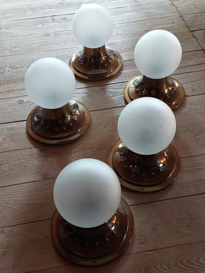 5 stück schön gearbeitete messing deckenleuchten im stil von otto wagner, ca 1980, gedrückte messing montage leicht patiniert mit mattglaskugel. e27 fassung