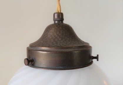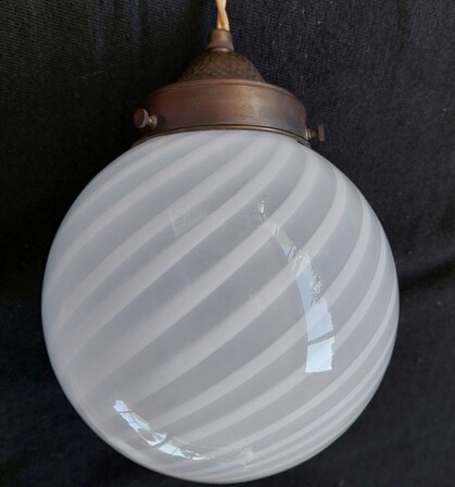 jugendstil deckenmontage um 1920, hammerschlag-dekor mit geschraubter original e27-messingfassung und wunderschön gleichmässig gearbeiteter murano swirl-glas kugel mit hals. so schön ist später selten mehr gearbeitet worden...