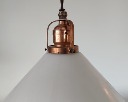 jugendstil hängeleuchte mit weissem, konischen opalglas und verkupferter metallfassung, original um 1910, an porzellan-deckenmontage. höhe nach wunsch
