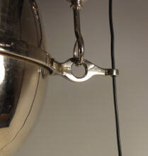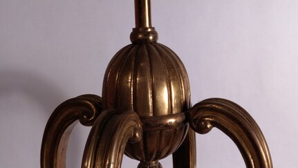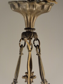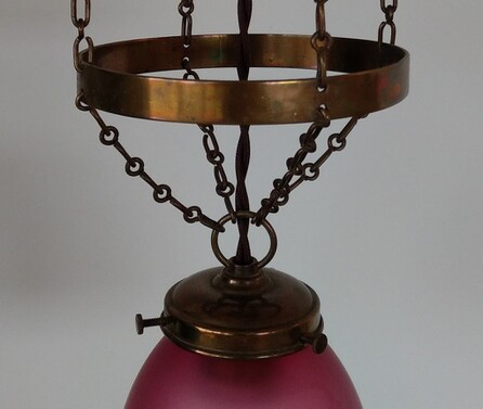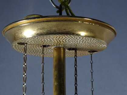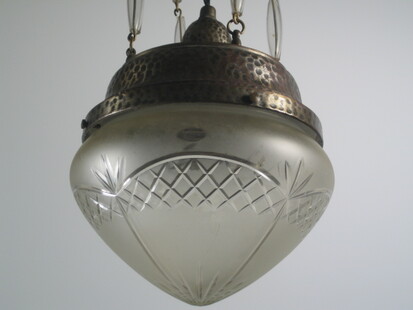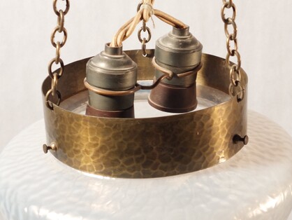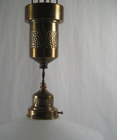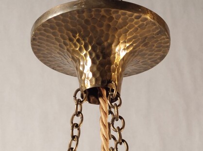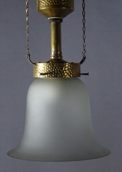 fein gehämmerte messingleuchte aus der vorletzten jahrhundertwende. kolbenförmiger auszug an ketten