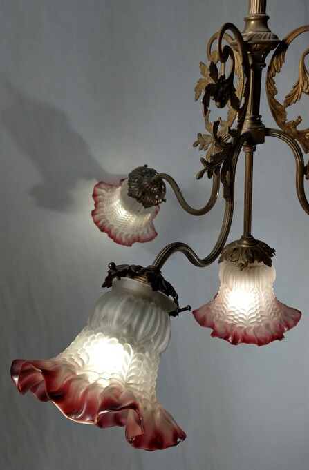 jugendstil bronzelüster mit 4 violetten blumengläsern 1900