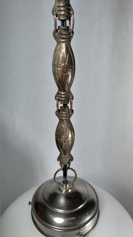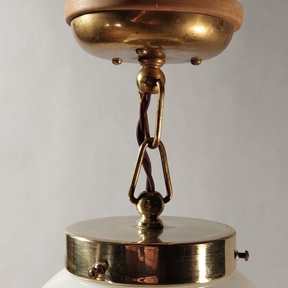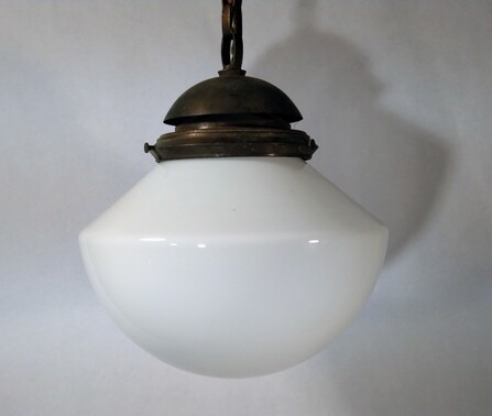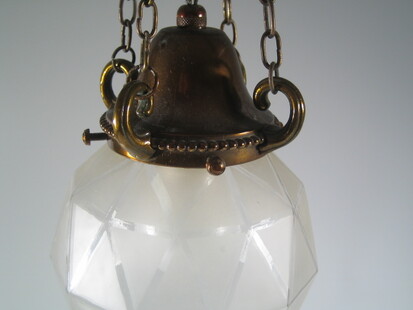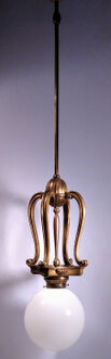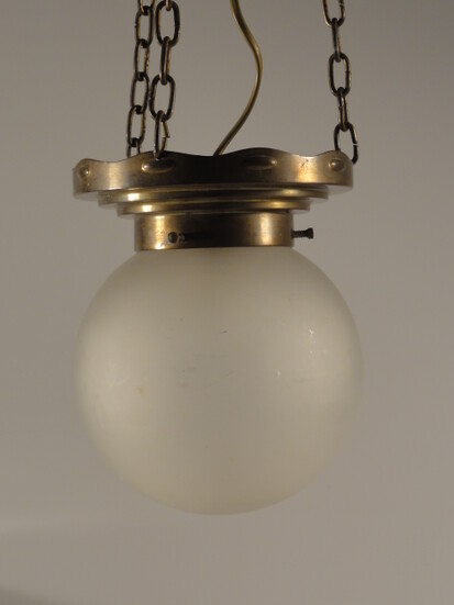 messing-hängeleuchte aus dem jugendstil. baldachin und messingmontage mit kurzer kette verbunden. dazu passend 2 verschiedene varianten von gläsern: entweder schlichte opalglas-kugel mit hals und 20 cm durchmesser und 35 cm gesamtlänge