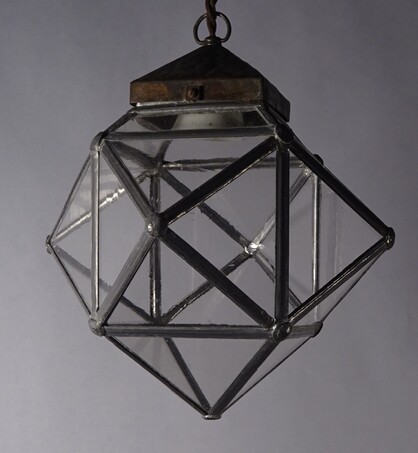 patinierte, an kette abgehängte "kugel" aus gleichmässigen dreiecken, ein sogenanntes tetraeder. originale gläser, kaltgewalzt, mit den typischen lufteinschlüssen, verbunden durch bleistege, wiener schule zugeschrieben