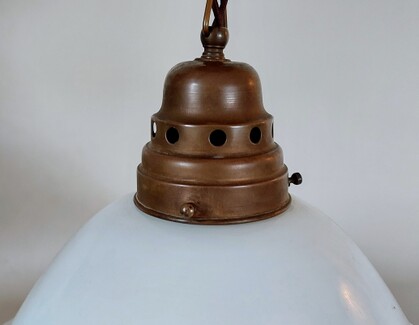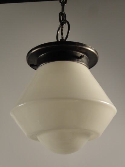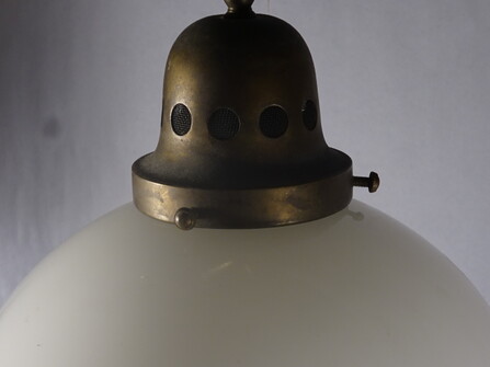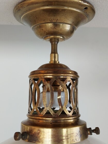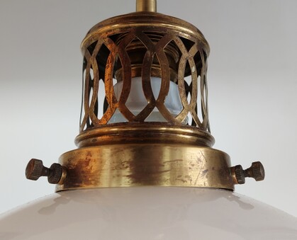 sehr schön proportionierte deckenleuchte aus einem zug oder tram der vorletzten jahrhundertwende. gitterartig durchbrochene messingaufhängung mit geschraubter e27-fassung und porzellanring. breit auslaufendes, abgesetztes opalglas, unten offen