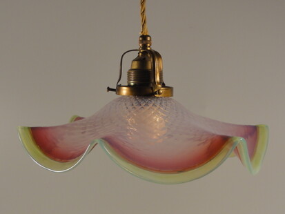 schöner, dickwandiger glasschirm, wellenartig geschweift, verlauffarbe von opaleszierend weiss zu hellrosa und dunkelrosa mit gelbem rand und feinem kreuzrippenmuster