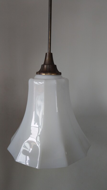 grossartige, seltene deckenleuchte: mehreckiger kelch aus der vorletzten jahrhundertwende aus dickwandigem opalglas an patinierter messingaufhängung