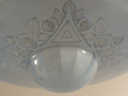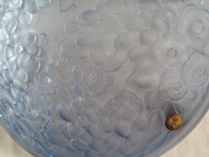 jugendstil oder florales art déco, blaue pressglas deckenschale, frankreich, mit blumendekor, signiert