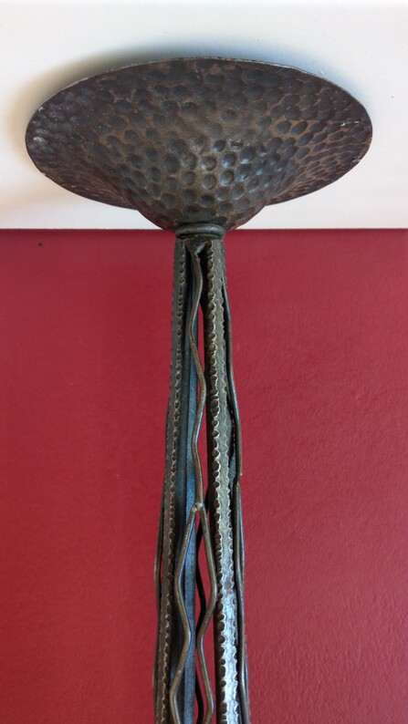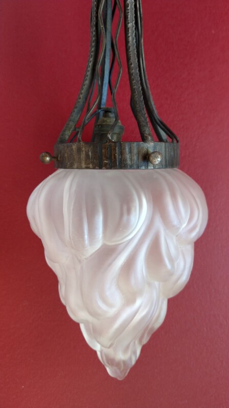 lange, schlanke deckenleuchte aus dem jugendstil, original, schön gehämmertes schmiedeeisengestell mit mattgeätztem flammenglas, bjonettfassung