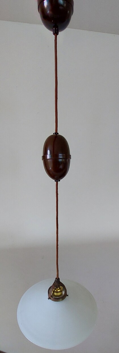 ausziehbare küchen- oder esstischleuchte aus den 30erjahren aus braunem bakelit mit tellerförmigem opalglas (kann auch gegen ein kegelförmiges etc ausgetauscht werden)