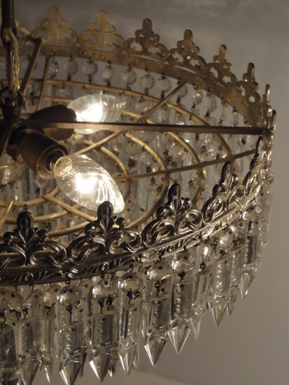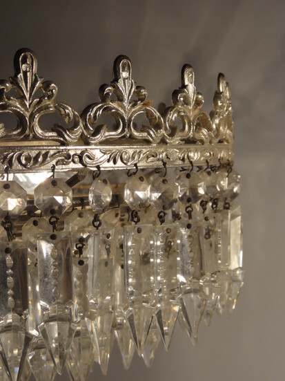 vernickelter kronenkranz mit zahlreichen geschliffenen kristallabhängern, originaler und vollständiger kristallbehang an insgesamt 7 ringen