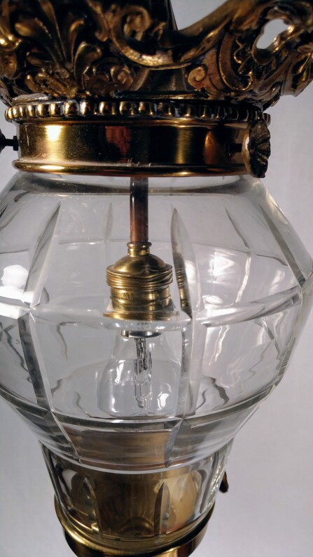 schwere und massive messing guss leuchte, feuervergoldet? mit geschnittenem und facettierten kristallglas im barock stil