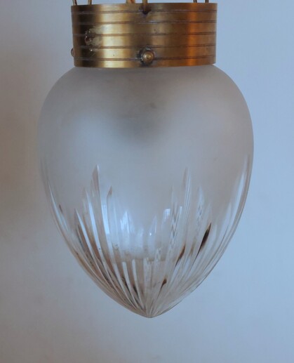 kleinere jugendstil hängeleuchte mit tropfenförmigem glas, geschnitten und geätzt. an messing ringen und ketten abgehängt originale messing-fassung e27 mit porzellanring,