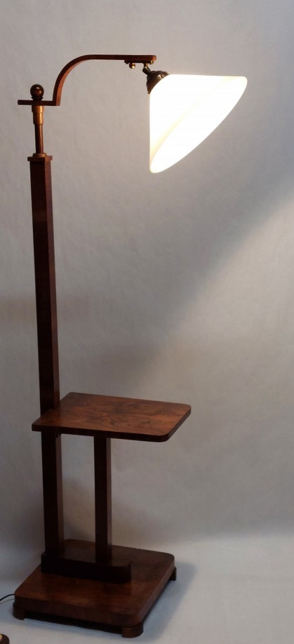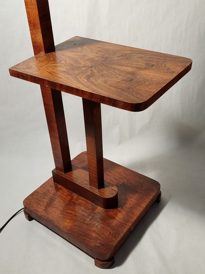 grossartige stehleuchte aus furniertem holz aus den 30erjahren im typischen geometrischen art déco-stil aus deutschland. konischer opalglasschirm mit warmem braunton, eckige holzablage und schöner fuss. fussschalter (nicht original)