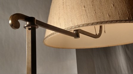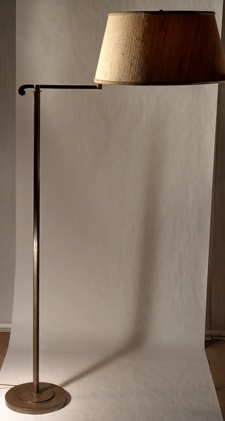 ausladende stehleuchte um 1925 mit modernistischem stufenfuss aus brüniertem messing, sechseckigem hals und schwenkbarem seitenarm mit originalem rohseidenschirm, 2 x e27-fassung mit zugkette