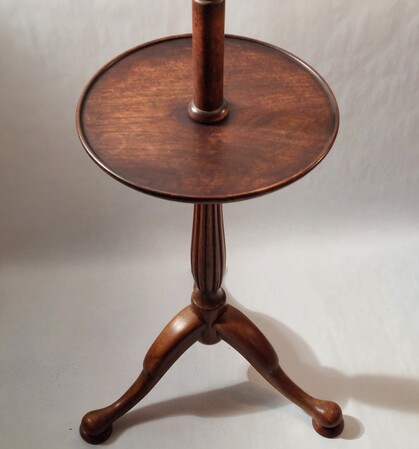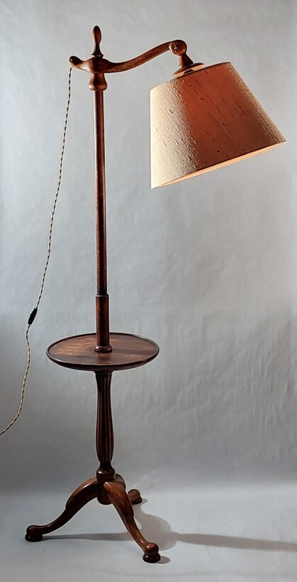 hübsche und ausgewogene stehleuchte vom anfang des letzten jahrhunderts mit tablar und dreibeinigem, geschwungenem stand aus kirschbaumholz (?), fassung und verkabelung erneuert. höhenverstellbar & drehbar