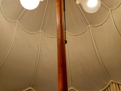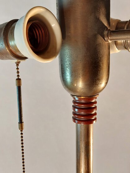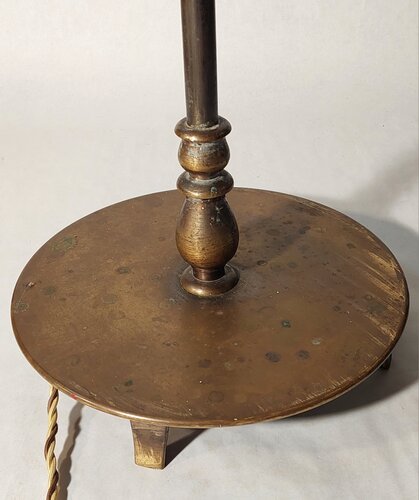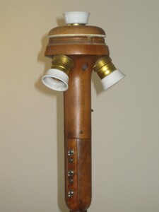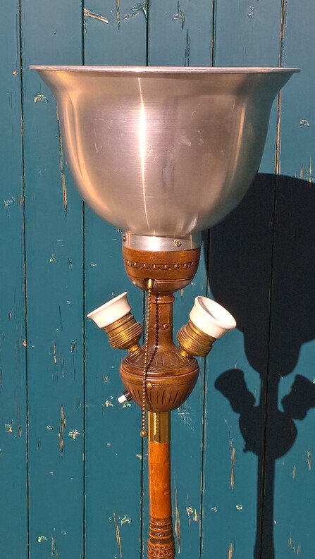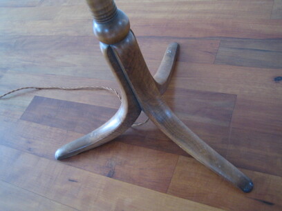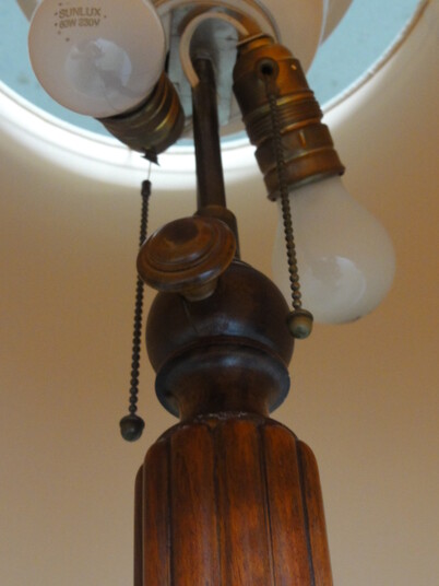 auf massivem holzfuss. insgesamt drei lampenfassungen: die obere, indirekte, mittels fussschalter (modern) separat schaltbar plus zwei fassungen mit zugschaltern im schirm