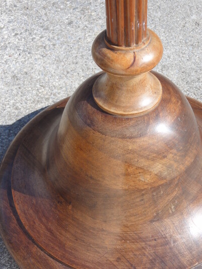 dunkler, schwerer holzfuss in form einer glocke mit fein geripptem, edlem holzholm, sich gegen unten verjüngend, was der leuchte optische leichtigkeit verleiht,