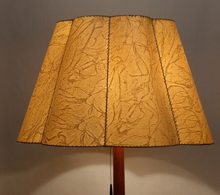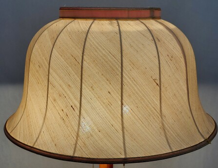 dazu passend der leicht rötliche seidenschirm der weiter unten abgebildeten spinnradleuchte - dieser hat aber einen kleinen riss. passende schirme nicht immer verfügbar - auf anfrage ab 120 fr.