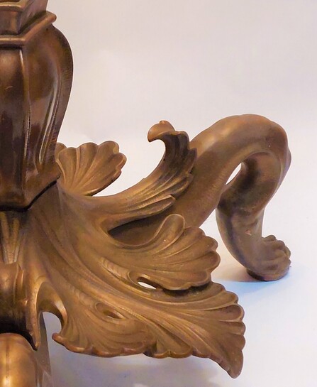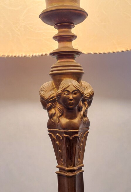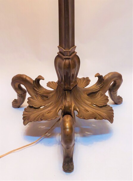 reich verzierter bronzeguss, sehr schwer, ca 15 kg, organisch ausgeformter stand mit 3 raubtier-füssen, schaft mit 3 grazien. 2 e27-fassungen mit zugschaltern. der wellige schirm besteht aus originalem, handgeschöpftem papier (guter originalzustand, nicht verraucht, vernähung an 2-3 stellen etwas brüchig).