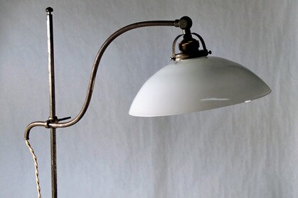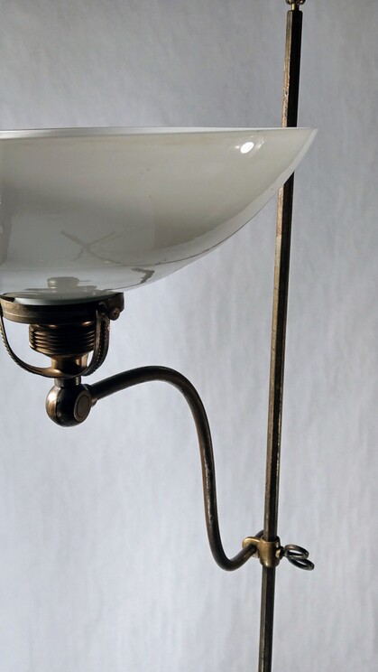 feingliedrige stehleuchte ca 100jährig, geschmiedeter und gebogener stahl, vermutlich belmag, stufenlos verstellbar in der höhe, der opalglasschirm um 180 grad gegen oben schwenkbar - auf wunsch auch mit grünem glas oder weiss-konisch