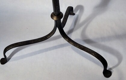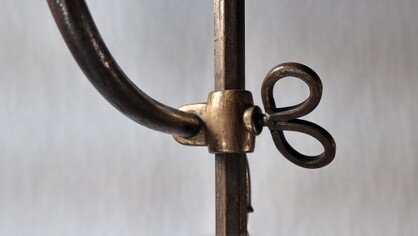 ein stück schweizer geschichte und kunsthandwerk-tradition: vorzüglich restaurierte bodenleuchte aus teilen eines spinnrades, genannt kunkel, um 1800. gedrechseltes und geschnitztes holz mit aufwendigen metallapplikationen am schaft. dieser wurde um 1930 durch einen alureflektor ergänzt und so zur stehleuchte umfunktioniert. stabil und fest. der runde holzfuss mit einer schweren eisenplatte steht auf drei dünnen holzbeinchen.