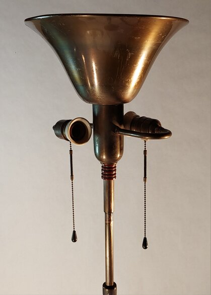 seltener vorläufer der berühmten indi-leuchte von bag turgi. der modernistische indirekte deckenstrahler "indi" ist aus diesem oder einem ähnlichen vorläufer aus dem jugendstil hervorgegangen. der typische und unverwechselbare bakelit zugschalter im standrohr ist bereits vorhanden, jedoch ist das kopfstück der leuchte noch für einen lampenschirm gedacht. das ist an den beiden zugfassungen links udn rechts erkennbar, die bei diesem vorläufermodell wie bei allen leuchten aus dieser zeit unter dem stoffschirm versteckt waren. bei der indi-leuchte wurde dann auf den schirm und die seitenarme verzichtet und sie bekam einen zeitgemässeren fuss.
