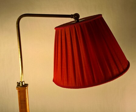 typische und gemütliche holzstehleuchte um 1940, furnierter holzfuss und holzschaft mit ausziehbarem metallhals, roter stoffschirm, zugschalter