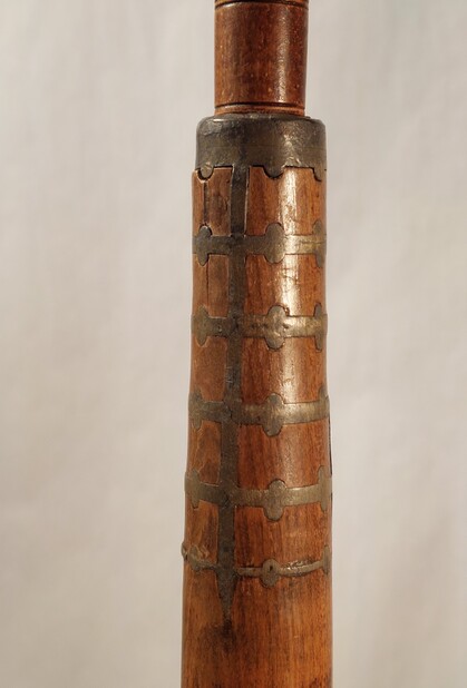 sehr alter spinnrocken, mitte 19 jahrhundert, umfunktioniert zu einer stehleuchte mit handgewobenem textilschirm, innen mit seidenbezug.