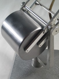 crèmefarbener stand mit kippmechanismus, daran ein zweiteiliger (trennbarer) aluminiumkopf, eine art lichtkanone, mit runder öffnung
