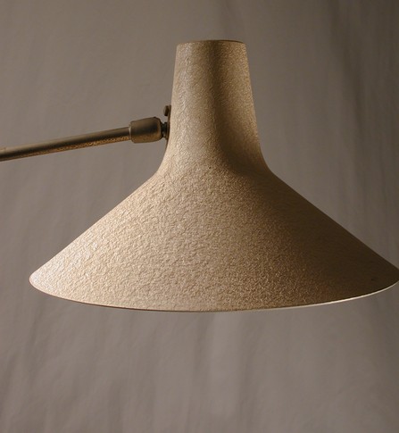 tellerförmiger aluminiumreflektor auf schwerem, konischem gussfuss, in der länge verstellbar und an drei gelenken kippbares messinggestänge.