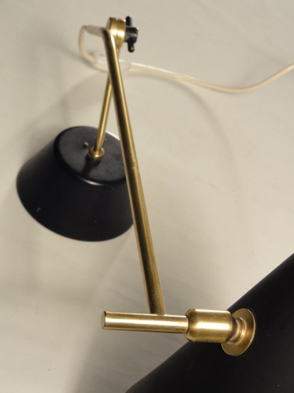 harmonische leseleuchte oder schreibtischlampe mit breitem schrumpflackschirm mit schön geschwungenem messingrohr aus schwarzem gussfuss, gebrüder cosack neheim