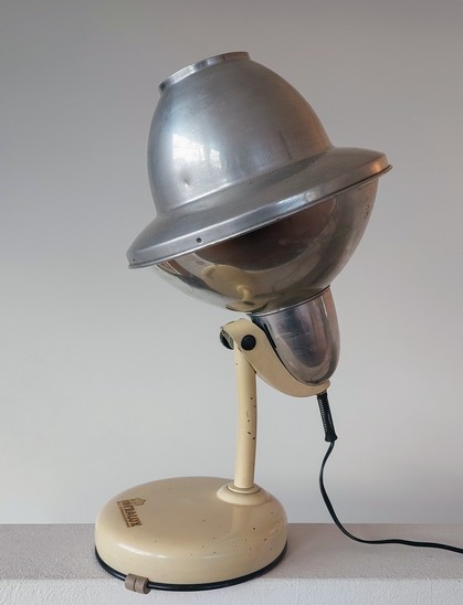grossartiger udn ziemlich kultiger megaspot - im prinzip ein bestrahlungsapparat aus der nachkriegszeit (originale wärme"birne" vorhanden). lässt sich dank seiner e27-fassung problemlos mit jeder zeitgemässen birne bestücken (auch led). marke infralux.