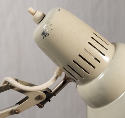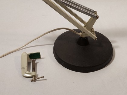 originale créme-beige farbe mit kleineren gebrauchsspuren am reflektor. ansonsten sehr guter zustand. sowohl mit gusseisenfuss (zur zeit in schwarz) als auch mit schraubklemme.